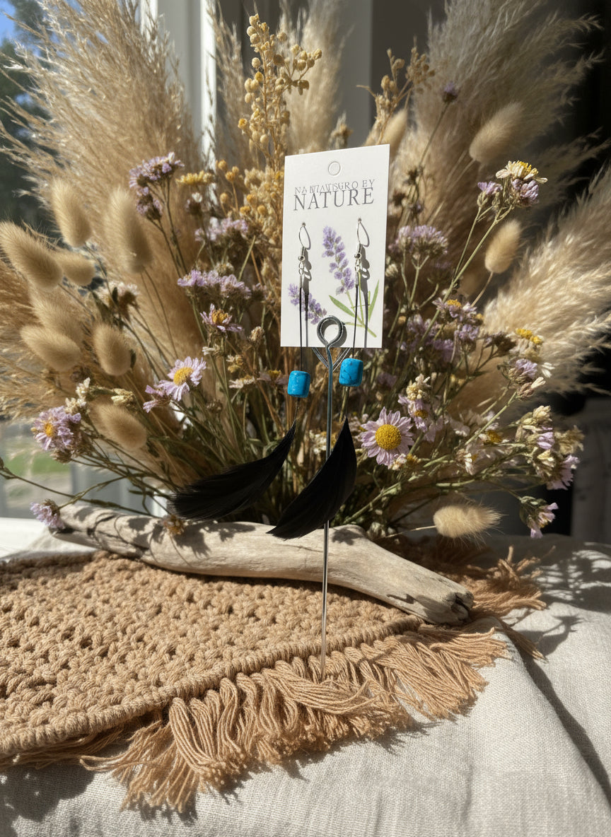 Add a splash of whimsy to your look with these black feather earrings topped with vibrant blue glass beads. Each pair is carefully handmade, blending natural charm with a touch of bold color. Lightweight and eye-catching, they flutter with your every move, perfect for turning heads at any gathering or simply brightening your day with a playful pop of style. Embrace your unique sparkle and let these earrings be your new favorite conversation starter!