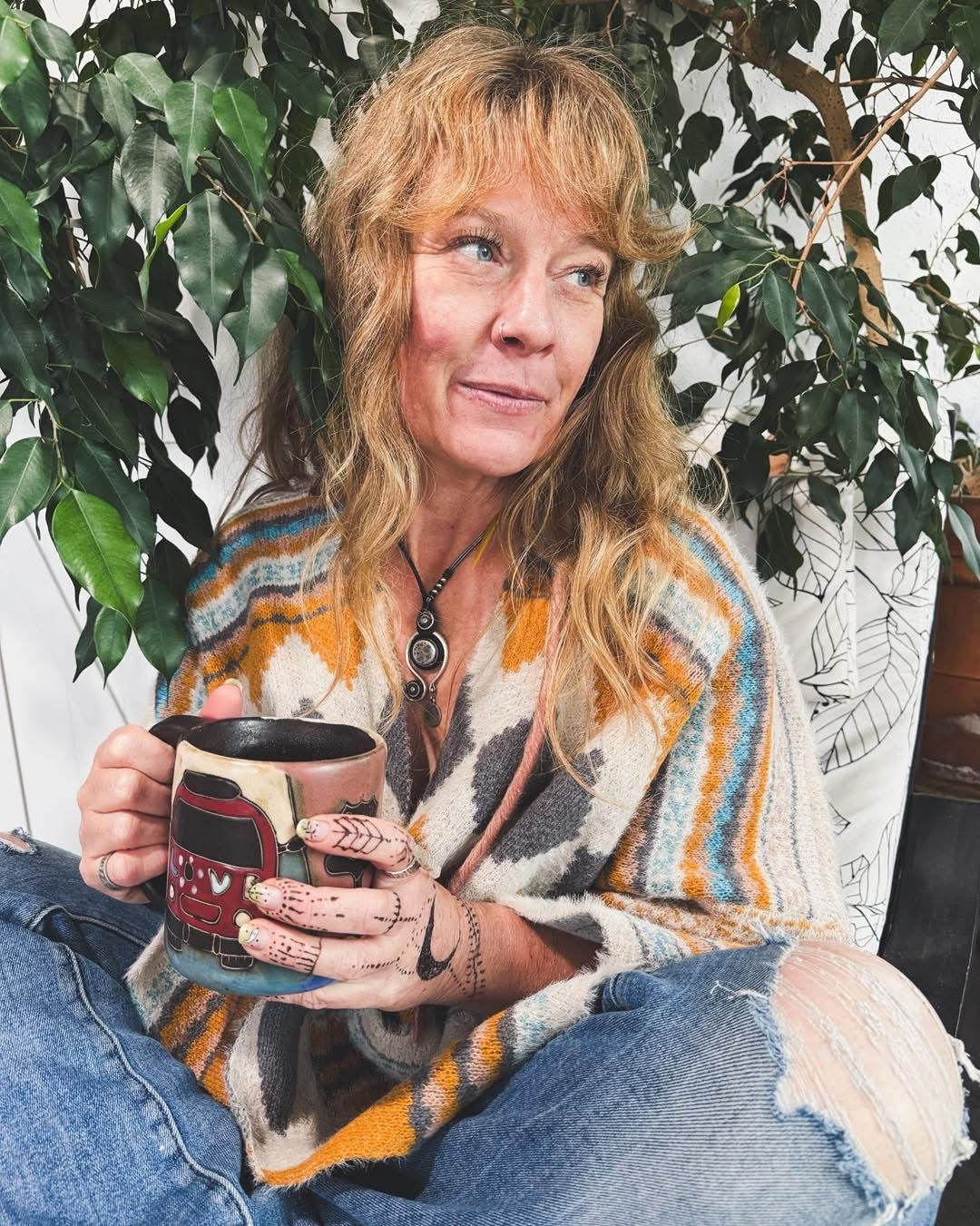 Boho Faux Fur Ruana Wrap with Cozy Pockets - Tribal Cardigan: Dark Mustard