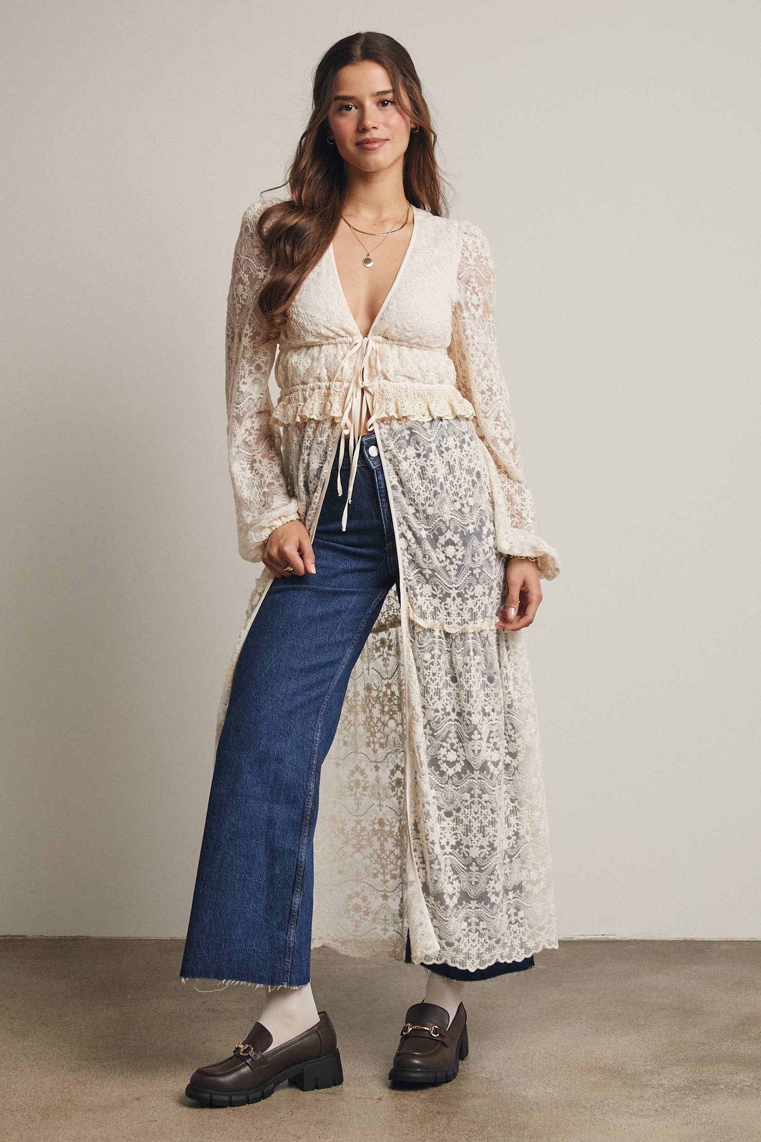 A stunning layering piece for boho, Western-inspired, or romantic looks, this duster blends timeless lace with modern edge-perfect for styling over denim or lace dresses for a dreamy, editorial-ready silhouette.